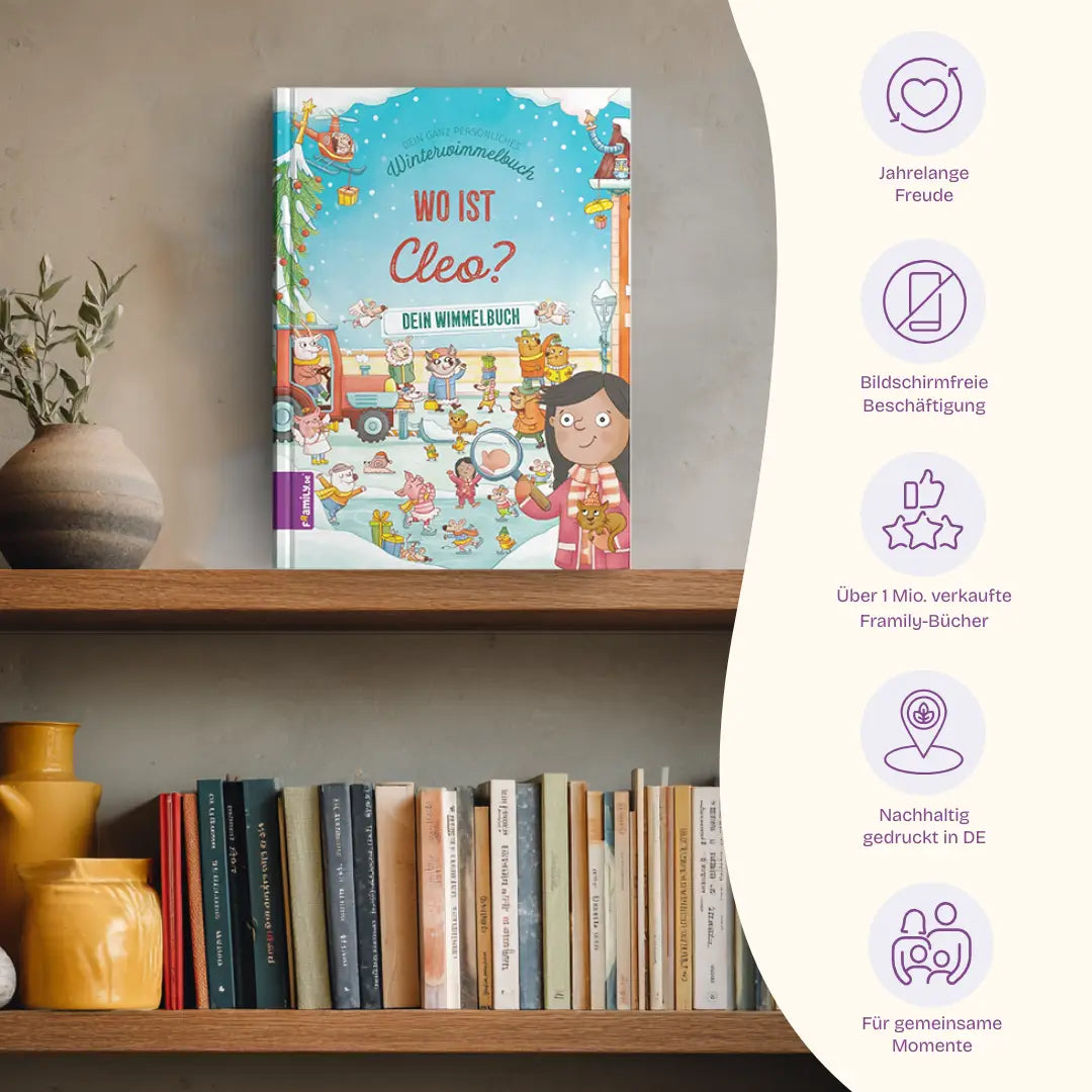 Entdecke dich selbst und die Weihnachtsfreuden in deinem personalisierten Winterwimmelbuch. Ein einzigartiges Geschenk. Hochwertiges Bilderbuch mit festem Einband im Format 19 x 25 cm. Für lange Haltbarkeit mit Lieblingsbuch-Garantie. Inklusive einer individuellen anpassbaren Widmungsseite mit Fotoupload. Für kleine und größere Leute im Alter von 2 bis 99 Jahren.